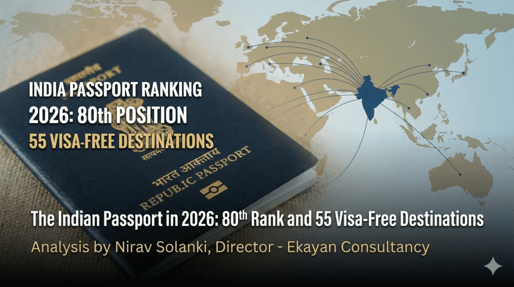Cover photo for a indian passport rankig article featuring an Indian Republic passport against a world map background. Text overlays read: "INDIA PASSPORT RANKING 2026: 80th POSITION", "55 VISA-FREE DESTINATIONS", "The Indian Passport in 2026: 80th Rank and 55 Passport-Free Destinations", and "Analysis by Nirav Solanki, Director - Ekayan Consultancy